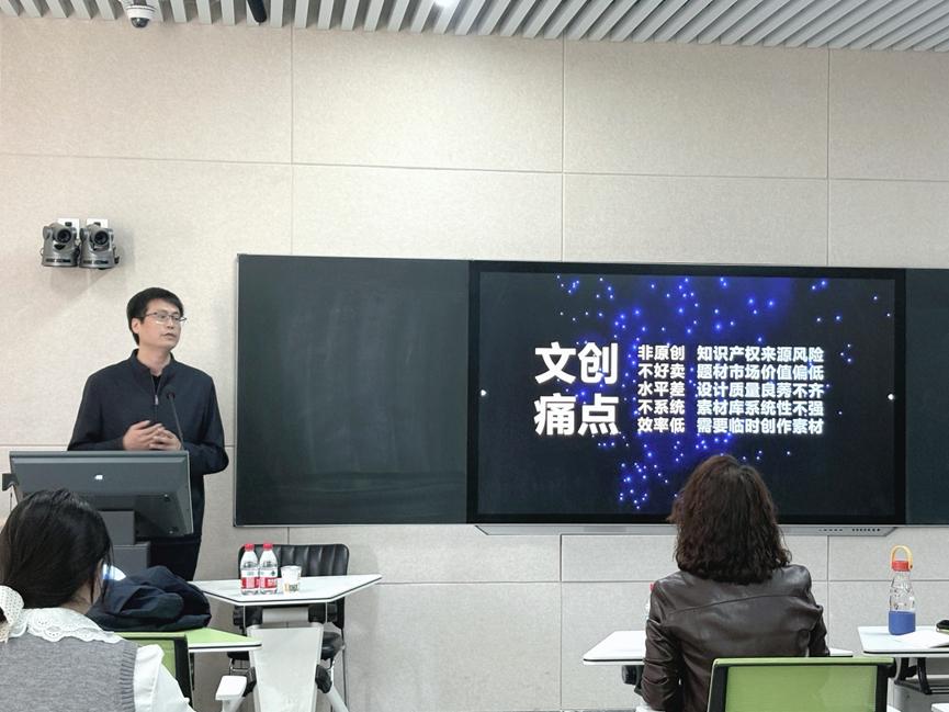 讲座伊始,张野教授紧扣文创设计领域发展实际,深入剖析原创力不足、体系构建缺失等行业痛点问题,系统阐释文化基因图谱的理论内涵,并围绕基因提取、图谱转译、图谱应用三大核心环节,详细讲解传统文化视觉化、体系化转化的研究范式。他结合颐和园文化基因构建、传统文创活化等典型案例,深入解读文化原真性传承与当代视觉转译的核心原则,分享文化基因图谱的设计研究与实践路径。讲座最后,张野教授现场开放提问交流环节,为与会师生提供了深入探讨、互动学习的平台。